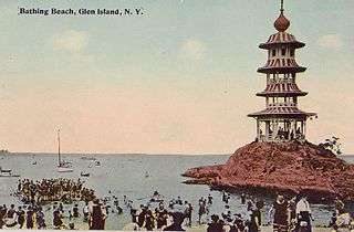 In 1879, former U.S. Congressman John H. Starin bought Glen Island and four nearby islands. He gave Glen Island its name and converted the islands into a summer resort for city dwellers that has been called "the first theme park".[2] The islands were connected by causeways and piers, and each island featured a different international theme.[3] Steamships transported visitors from New York City to the park.[4] The park, which opened in 1881, attracted thousands of people daily, included among its attractions a bathing beach, a natural history museum, a zoo, a German beer garden and castle, musical entertainment, and a Chinese pagoda.[2][5]