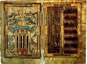 The Godescalc Evangelistary, Godescalc Sacramentary, Godescalc Gospels, or Godescalc Gospel Lectionary (Paris, BNF. lat.1203) is an illuminated manuscript made by the Frankish scribe Godescalc and today kept in the Bibliothèque nationale de France. It was commissioned by the Carolingian king Charlemagne and his wife Hildegard on October 7, 781 and completed on April 30, 783.[1] The Evangelistary is the earliest known manuscript produced at the scriptorium in Charlemagne's Court School in Aachen.[2] The manuscript was intended to commemorate Charlemagne's march to Italy, his meeting with Pope Adrian I, and the baptism of his son Pepin. The crediting of the work to Godescalc and the details of Charlemagne's march are contained in the manuscript's dedication poem.