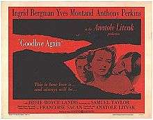 Goodbye Again, released in Europe as Aimez-vous Brahms?,[2] is a 1961 romantic drama film produced and directed by Anatole Litvak. The screenplay was written by Samuel A. Taylor, based on the novel Aimez-vous Brahms? by Françoise Sagan. The film, released by United Artists, stars Ingrid Bergman, Anthony Perkins, Yves Montand, and Jessie Royce Landis.