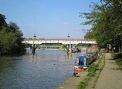 A bridge was first built here in 1837 being a flat timber bridge of beams on posts. Prior to this there was a ferry although occasionally people would ride across, even driving in a one-horse chaise. In 1674 the ferry turned over in the weir pool with the loss of sixty lives.[2] In the 1970s a Citroën Dyane crashed through the railings at the Streatley end of the bridge landing on a concrete weir 16 feet below. The local Citroën dealer used the photo to illustrate the inherent strength of their upmarket 2CV