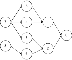 In the following diagram, there are four stacks: {7,3,1,0}, {7,4,1,0}, {7,5,2,0}, and {8,6,2,0}.