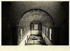 Bramante projected the two Cloisters of Sant'Ambrogio and between them built a refectory. The refectory was painted by Callisto Piazza, who provident in 1545 to adorn the wall with a magnificent fresco, still visible, showing the "Wedding at Cana". The facade and the statue of Christ the King are recent additions and designed by the architect Muzio. Since the 1930s the hall has undergone a major restoration to be used as great hall of UCSC.[1]