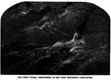 The first Eddystone Lighthouse off Plymouth was destroyed[4] on 27 November 1703 (Old Style), killing six occupants, including its builder Henry Winstanley. (John Rudyard was later contracted to build the second lighthouse on the site.) A ship torn from its moorings in the Helford River in Cornwall was blown for 200 miles (320 km) before grounding eight hours later on the Isle of Wight.[4] The number of oak trees lost in the New Forest alone was 4,000.