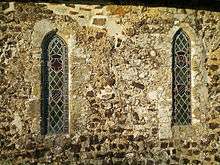 Greatham Church is a tiny, primitive, unrestored building dating from the "Saxo-Norman overlap" period when Anglo-Saxon architecture was giving way to the Norman style.[3][6][7][12] The writer Arthur Mee was once told not to mistake the church for a haystack:[5] set in the middle of fields and on its own apart from the manor house,[2] it has an extremely basic and modest feel—amplified by its lack of electricity and piped water.[6] The walls, of unequal length and thickness,[6] are principally of ironstone with some chalk, flint, Roman-era masonry and rubble, local (Pulborough) sandstone and Horsham Stone.[4][5][7] Ian Nairn described them as having "a wonderful texture".[2] At one corner, the Pulborough sandstone quoins have a set of roughly carved crosses. These are believed to be consecration crosses, which were blessed when the church was completed and consecrated.[6][7] The building has a single room with no division between the nave and chancel. There is also a slate-hung bell-turret with a small spire.[2][12] The windows, inserted in the 13th century, are Early English-style lancets. The roof is an old, but not original, king post structure.[6]