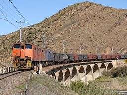 | Train approaching Laingsburg crossing the bridge over the Buffels River, the upper section of the Groot River | |