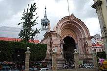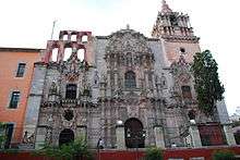 Other important churches include the Temple of Guadalupe from the 18th century in sober Baroque, the Pardo Church from the 18th century with a façade covered with sculpted plants.[4] The San Francisco Church on Sopeña Street faces a plaza with the same name.[4] It has a Baroque façade of pink stone with a green tint, a staircase with wrought iron railings and a small fountain.[35][46] The Belén Church was built in the 18th century by the Count of Valenciana with a modest façade. It is across from the Hidalgo Market and on the street leading to the Alhóndiga de Granaditas.[4][46] The Mellado Church was part of the Merced Monastery. The cloister area is now in ruins but the church remains and is dedicated to the veneration of Our Lady of Mercy. The original Baroque altarpieces were replaced with Neoclassical ones in the 19th century.[35]
