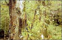 Since 1980, the gypsy moth has defoliated over one million acres (4,000 km2) of forest each year. In 1981, 12.9 million acres (52,200 km2) were defoliated. In wooded suburban areas, during periods of infestation, gypsy moth larvae crawl over man-made obstacles and sometimes enter homes.[2] When feeding, they leave behind a mixture of small pieces of leaves and frass, or excrement. During outbreaks, the sound of moths chewing and dropping frass may be loud enough to sound like light to moderate rainfall.[3] Gypsy moth populations usually remain low, but occasional increases to very high levels can result in partial or total defoliation of host trees.[4]