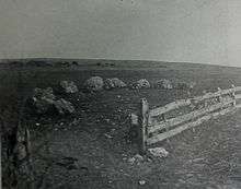 Commenting on the site in 1939, the archaeologists Stuart Piggott and Cecily Piggott opined that ten stones in the eastern half were likely in their original position.[20] As of 1939, a hedge and bank split the circle in two, from north-to-south, separating the three most westerly stones from the rest of the circle.[20] They expressed the view that "owing to [the stone's] rough cube-like shapes it is impossible to decide whether they are upright or recumbent".[20] Based on what they believed to be the sites in their original position, they estimated the circle's original diameter at 35 feet (11-12m).[27]