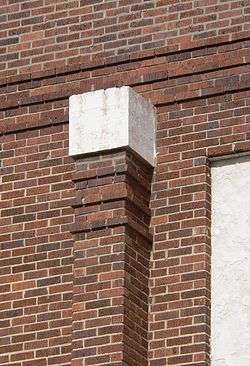 The central bay of the south facade of the Hartington City Hall and Auditorium is highly effective Prairie School architecture (the nearly hidden north facade is similar). The bulk of the wall surface is simple running bond brickwork, forming a uniform ground for the interplay of horizontal and vertical lines. The stone coping at the roofline forms the highest horizontal line. Not far below is a horizontal band of triple corbelling that surrounds the building. This effect is created by projecting three courses of brick out farther than the wall below (as in a corbel), repeating it with three more courses of brick, and then repeating it again for the entire rest of the wall up to the copestone. Steele adds depth and interest to this band by varying the projection of each of the three brick courses by facade so that corners highlight one or another course (see photo below). This effective horizontal band is similar to but more sophisticated than what Steele used near the top of his noted First Congregational Church (Sioux City, 1916–1918). Additional horizontal lines derive from the original three bands of windows (particularly prior to more recent window alterations). These consistent horizontal lines are dramatically emphasized by the strong counterpoint of the six vertical piers. Yet even these vertical pilasters have horizontal elements in their capitals, consisting of three horizontal bands of projecting brick string courses (which echo the triple corbelling above) and the contrasting capitals of cast stone on top. Across the set of six vertical piers or pilasters along the auditorium, these elements create additional horizontal lines.[12][23][27][30]