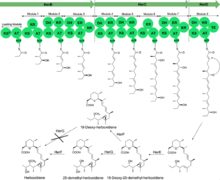 Biosynthesis of herboxidiene has been studied for over 20 years since its discovery. The precursor of herboxidiene, 18-deoxy-25-demethyl herboxitriene was first synthesized in Streptomyces chromofuscus through a nine-modules PKS I pathway. 18-deoxy-25-demethyl herboxitriene is then epoxidized by enzyeme HerE on the carbon carbon double bond between C14 and C15, oxidized by enzyme HerG on C-18 and eventually methylated by enzyme HerF on C25 to herboxidiene with the help of cofactor SAM.[5]