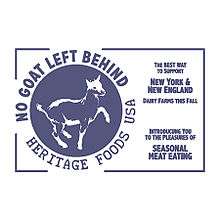 No Goat Left Behind is an effort launched in 2011 by Heritage Foods USA with the twin aim of introducing goat meat to American diners and developing a sustainable end market to support dairy farmers in the Northeast. To produce milk required for cheese making, female goats must have babies. This creates many unwanted males as a by-product of the dairy business.[6] "In extreme cases the kids are killed at birth to unburden the farmer from caring for goats with little market value." [7] Heritage Foods USA partners with 15 New York State and Vermont family farms to sell hundreds of goats to restaurants and home consumers throughout the month of October.[8] The project has acquired the name “Goatober", because as a result of naturally mating goat, kids are born in the early spring, graze on pastures all summer, and are then ready for harvest in October.[6]