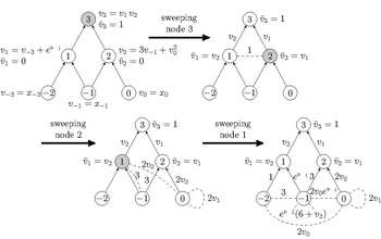 The algorithm's input is the computational graph of the function. After a preceding forward sweep where all intermediate values in the computational graph are calculated, the algorithm initiates a reverse sweep of the graph. Upon encountering a node that has a corresponding nonlinear elemental function, a new nonlinear edge is created between the node's predecessors indicating there is nonlinear interaction between them. See the example figure on the right. Appended to this nonlinear edge is an edge weight that is the second-order partial derivative of the nonlinear node in relation to its predecessors. This nonlinear edge is subsequently pushed down to further predecessors in such a way that when it reaches the independent nodes, its edge weight is the second-order partial derivative of the two independent nodes it connects.[2]