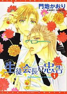 Hey, Class President! (生徒会長に忠告 Seitokaichou ni Chukoku) is a Japanese yaoi manga written and illustrated by Kaori Monchi. The manga was serialized in Shinshokan's Dear+ magazine and the serial chapters collected into four tankōbon, the first one released in September 2005,[1] and the fourth in May 2009.[2] It is licensed in English by 801 Media, and the two volumes were released in March and May 2009.[3] It is licensed in German as "Highschool Love" by Egmont Manga and Anime.[4]
