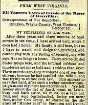 At first the new settlement was welcomed, but after John Brown's raid on Harpers Ferry in 1859 local residents became hostile to the Ceredo colony.[53] During the war Ceredo became a focus of Unionism and raised Union militia. This made it a favorite target for local Confederate raiders like William "Rebel Bill" Smith and by the end of the war Ceredo was almost abandoned.