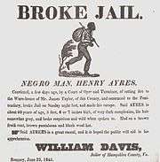 In 1835 slaveowners in Jefferson County petitioned the General Assembly for redress for the loss of runaway slaves. In response, the General Assembly passed an act incorporating "The Virginia Slave Insurance Company" in Charlestown.[65] The Fugitive Slave Act returned a number of slaves to western Virginia. Just before the Civil War a slave belonging to the Jackson family in Harrison County escaped to Ohio by stealing a horse, but was returned under the act and sold lower south.[66] One of the last slaves ever returned under the act was Sara Lucy Bagby, who had also escaped to Ohio and was restored to her owner in Wheeling on January 24, 1861.[67] Sara Bagby was freed during the war and moved to Pittsburgh.[68] Slaves who ran away and were returned, or at risk of flight, were often sold. In 1856 in Point Pleasant, Mason County, two slaveholders sold their eighteen slaves for $10,600 to a Richmond dealer when it was discovered that they had been planning an escape.[69] A slave owner in Kanwaha County sent his remaining slaves to Natchez for sale after two had run away.[70]