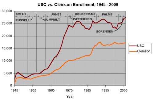 After World War II, enrollment at the University swelled from the influx of veterans. They were wholeheartedly welcomed by President Smith who actively campaigned for their attendance and he announced that every qualified veteran would be admitted to the University. The vast majority of South Carolina veterans chose to attend the University because of its hospitable atmosphere, but also for other reasons. They did not want to attend Clemson or The Citadel because "the prospect of returning home to attend a military college was distasteful for the older men leaving the military after fighting the largest war in world history."[15] In addition, Clemson's rural location and its self-imposed restriction on the number of students made it inaccessible for a large number of veterans. The University offered several special programs to meet the needs of the veterans and it continued an accelerated calendar until 1949. It was at this point in history that the two universities switched reputations and missions. Carolina became known as the university for the common man and an institution accessible for all whereas Clemson settled into a status of elitism.[15]