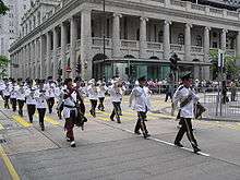 The Remembrance Sunday observance in Hong Kong is marked by a multi-faith memorial service at the Cenotaph. The service is organised by the Royal British Legion (HK & China Branch) and the Hong Kong Ex-Servicemens Association and is attended by various Government officials, as well as representatives of various religions including the Anglican Church, the Roman Catholic Church, the Eastern Orthodox Church, the Buddhist community, the Taoist community, the Muslim community and the Sikh community. Although Hong Kong ceased to be part of the Commonwealth of Nations in 1997, the memorial service still resembles those in many other Commonwealth countries. The service includes the sounding of "Last Post," two minutes of silence, the sounding of "Reveille", the laying of wreaths, prayers, and ends with a recitation of the "Ode of Remembrance". The Hong Kong Police Force Pipe Band continues to perform their ceremonial duty at the service.