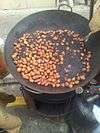 | Chestnuts are stir-fried with black sand and sugar in a wok. |