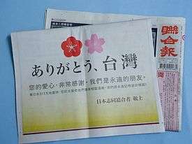 - ↑ "Taiwan's charity organizations ready to launch relief aid to Japan". focustw.tw. 2011-03-15. Retrieved 2011-03-15.