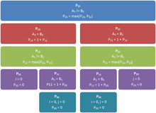 A table showing the recursive steps the basic longest common subsequence algorithm takes.