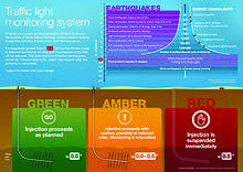 In late May 2011, the first UK exploration for shale gas using high-volume hydraulic fracturing was suspended at Preese Hall in Lancashire after the process triggered two minor earthquakes.[5] The larger of the earthquakes caused minor deformation of the wellbore[6] and was strong enough to be felt.[7] The report of 2012 by the Royal Society and the Royal Academy of Engineering concluded that earthquake risk was minimal, and recommended the process be given nationwide clearance, although it highlighted certain concerns,[8] that lead to a raft of regulation for the industry.[9] A detailed briefing paper was issued in late 2015 for the Houses of Parliament. This gives a full review of current thinking.[10]