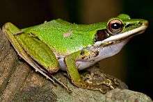Hylarana raniceps are relatively small frogs: adult males measure 28–34 mm (1.1–1.3 in) and females 33–42 mm (1.3–1.7 in) in snout–vent length.[3] Colouration is mostly green, sometimes with brown back. The snout is long and pointed. Finger and toe tips have adhesive disks. The thighs may be reddish undersides. It resembles Hylarana megalonesa but is much smaller. Tadpoles are conspicuous with dark markings and red gills on light brown to yellow background; presumably they are poisonous.[4]