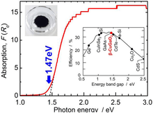 Optical absorption spectrum of β-CuGaO2 powder (top left inset) obtained from diffuse reflection measurements. The right inset shows the Shockley-Queisser limit for the efficiency of a single-junction solar cell under unconcentrated sunlight.[2]