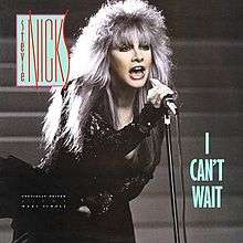 "I Can't Wait" is a 1986 song by American singer-songwriter Stevie Nicks. It was released as the first single from her third studio album Rock a Little in Australia, the UK and Ireland, and as the second single from the album in the US and Germany. "I Can't Wait" first charted in Australia, debuting on the Kent Music Report top 100 singles chart on 13 January 1986,[1] peaking at #20 in February.[2] The single first entered the UK chart on 25 January 1986, peaking at #54 in early February; her first single to chart there since 1981's "Stop Draggin' My Heart Around".[3] "I Can't Wait" spent a solitary week on the Irish chart at #29 on 23 January 1986.[4] In New Zealand, the single entered the chart on 16 February 1986, peaking at #39 the following week.[5] The song peaked inside the US top 20 at #16 for two weeks and is one of only four of Nicks' singles to enter the US Dance charts peaking inside the top 30.[6] In Germany, "I Can't Wait" entered the chart in early May 1986, peaking at #58 two weeks later.[7]