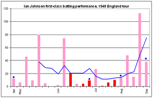 Johnson had more success in the tour matches, taking 85 wickets at 18.37 in all first-class matches. This placed him third in the wicket-taking and fifth in the averages among the Australians.[102] In the first-class matches excluding the Tests, Johnson was the leading wicket-taker.[101][102] He bowled more overs than anyone but Johnston, allowing Bradman to ease the workload on his pace spearheads Lindwall and Miller, allowing them to conserve energy ahead of the Tests.[102] Johnson's most successful game with the ball was against Gloucestershire, which yielded match figures of 11/100.[57] Like his bowling, Johnson’s batting was also more successful outside of the Tests, scoring 543 runs at 30.16 in 22 innings, with a top-score of 113 not out against Somerset and an 80 against a MCC team that consisted almost entirely of Test players.[19][102] Johnson usually batted at No. 7 or No. 8, although he was notably used as a makeshift opener in the Third Test and scored an aggressive 74 at No. 3 in the run-chase against Hampshire.N-[1] Johnson was prominent in the field, taking 23 catches, the most by a non-wicket-keeper on tour. He usually fielded in the slips.[102]