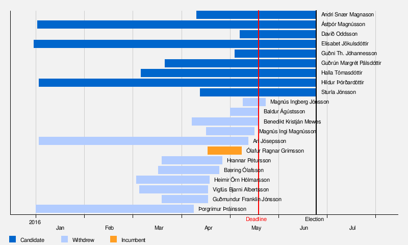 On 1 January 2016, incumbent president Ólafur Ragnar Grímsson announced that he would not seek a sixth term in the office, wanting "to transfer the responsibilities of the president onto other shoulders".[1][6][7] He later retracted and decided to run in April,[8] citing political unrest after the fallout of the Panama Papers leak, which implicated Prime Minister Sigmundur Davíð Gunnlaugsson and forced him to resign after large anti-government protests.[9] In the following ten days five other candidates suspended their campaigns, one of them after endorsing Ólafur Ragnar. Former Prime Minister Davíð Oddsson declared his candidacy on 8 May, and Ólafur Ragnar withdrew from the race the following day, stating that there was now a supply of qualified candidates. A poll showing Ólafur Ragnar with only 25% support had been published the same day.[10]
