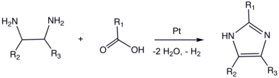 - ↑ Debus, Heinrich (1858). "Ueber die Einwirkung des Ammoniaks auf Glyoxal" [On the reaction of ammonia upon glyoxal]. Annalen der Chemie und Pharmacie. 107 (2): 199–208. doi:10.1002/jlac.18581070209. From p. 205: "Die gereinigte Substanz stellt das oxalsaure Salz einer Basis dar, die ich mit Glyoxalin bezeichenen werde." (The purified substance constitutes the oxalic salt of a base, which I will designate as "glyoxaline".)