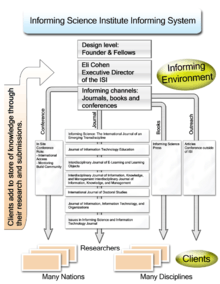 Informing science is a transdiscipline that was established to promote the study of informing processes across a diverse set of academic disciplines, including management information systems, education, business, instructional technology, computer science, communications, psychology, philosophy, library science, information science and many others. Its principal unit of analysis is the informing system, a collection of informers, clients and channels that has been designed or has evolved to serve a particular informing need. The organization created to advance the informing science transdiscipline is the Informing Science Institute (ISI), whose founder, Eli Cohen, proposed the need for field in his article "Reconceptualizing Information Systems as a Field of the Transdiscipline Informing Science: From Ugly Duckling to Swan" (Cohen, 1999). The ISI presently host an annual conference (Informing Science & Information Technology Education (InSITE)), publishes seven academic journals, and—through its Informing Science Press—has published for dozens of books. Both its journals and books are open access at no cost online, as well as being available for purchase in print form.