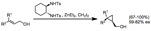 Simmons-Smith cyclopropanation, which employs carbenes derived from diethylzinc and diiodomethane, is a popular alternative to rhodium-catalyzed cyclopropanation. In the presence of a chiral diamine, Simmons-Smith cyclopropanation is enantioselective; however, selectivities are not as high as the corresponding rhodium-catalyzed reactions.[26]
