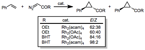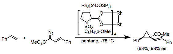 Methods for the stereoselective synthesis of cyclopropanes from diazocarbonyl compounds and olefins have relied on either the use of pre-formed chiral rhodium catalysts or chiral auxiliaries on the diazocarbonyl compound. For example, Rh2[S-DOSP]4 is a highly effective catalyst for the enantioselective cyclopropanation of alkenes.[10]
