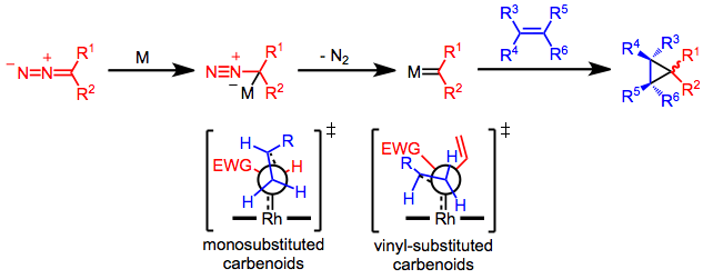 Cyclopropanes may be formed through the reaction of a metal carbenoid species (generated through the reaction of a diazo compound with a transition metal) and an olefin. Although the intramolecular variant of this reaction has been known since 1961,[2] chemo- and stereoselective intermolecular metal-catalyzed cyclopropanation reactions employing diazocarbonyl compounds are more recent. Rhodium carboxylate complexes, such as dirhodium tetraacetate, are most commonly used to catalyze this transformation.[3] Enantioselective cyclopropanations have been developed and typically make use of pre-formed chiral rhodium carboxylate complexes derived from chiral carboxylate ligands.[4]