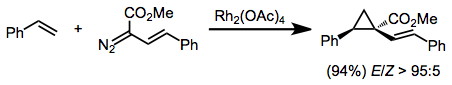 Diazoacetates substituted with a vinyl or aryl group on the diazo carbon are unreactive towards trans-alkenes. This result has been explained by invoking the transition state model in Eq. (2). Reactions of these substrates are highly selective for the (E) cyclopropane isomer.[19]