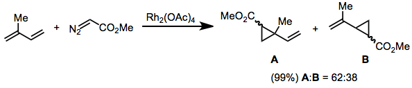 Cyclopropanation of olefins with diazocarbonyl compounds is most commonly accomplished using rhodium carboxylate complexes, although copper was originally used.[12] The scope of the olefin is generally quite broad—electron-rich,[13] neutral,[14] and electron-poor[15] olefins have all been cyclopropanated efficiently using rhodium-based catalyst systems. This section describes the various classes of diazocarbonyl compounds that react with olefins under rhodium catalysis to afford cyclopropanes.