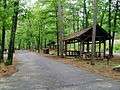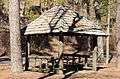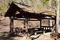 The picnic area includes three covered shelters, two of which were built by the CCC in 1933. The first is about 24 by 14 feet (7.3 m × 4.3 m), built with open log construction and topped by a gable roof. The north and south sides of the shelter have log balustrades, while the other two sides are open; a picnic table is set under the shelter.[3] The second is more square in shape, with a pyramidal roof, but also has balustrades on the north and south sides.[4]