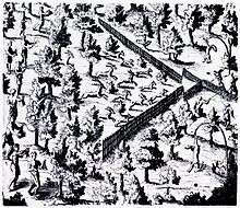 Samuel de Champlain's sketch of a Huron deer hunt; Huron men make noise and drive animals along a V-shaped fence towards an apex where they are captured and killed.