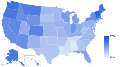 The Pew Religious Landscape survey reported that as of 2014, 22.8% of the U.S. population is religiously unaffiliated, atheists made up 3.1% and agnostics made up 4% of the U.S. population.[2] The 2014 General Social Survey reported that 21% of Americans had no religion with 3% being atheist and 5% being agnostic.[12]