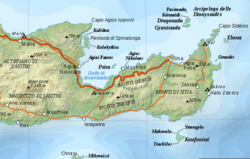 The Isthmus of Ierapetra (Greek: Ισθμός της Ιεράπετρας), has a length of 12 kilometres (7.5 mi), connects the north coast to south coast of the island and is the narrowest part of Crete.