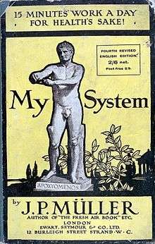 His book Mit System (My System), published in 1904, was a bestseller and has been translated to English and many other languages. My System explains Müller's philosophy of health and provides guidelines for the 18 exercises[2] that comprise the system, as well as photographic instructions featuring Müller himself.[3] Much of what was stated in his system has since been accepted by the medical community, with many of his basic movements being used in modern-day physical therapy and rehabilitation. The emphasis on body-weight exercise and the use of dynamic stretching is useful for many people, and has been found appropriate in a wide range of patients.