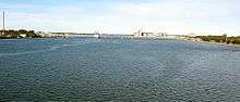 Jernbanebroen over Limfjorden (Limfjord Railway Bridge) is an iron railway bridge over Limfjord, a shallow sound, in Denmark. It was inaugurated on 23 April 1938. Since 2003, this has been the official name for the railway bridge between Aalborg and Nørresundby, though often it is simply called the Railway Bridge.[1] Formerly known as the "Limfjordsbroen", there is a road bridge, Limfjordsbroen, of the same name. The bridge connects Aalborg–Frederikshavn Line with Randers Aalborg railway. It has a single track and has a maximum authorized speed of 60 km / h. The nine span bridge is 403 metres (1,322 ft) long and has a width of 5.7 metres (19 ft). It is a bascule bridge with a counterweight of 400 tonnes. The bridge opens 4,000 times a year, and there are 10,000 annual sailings under it. Until 1 January 1997, it belonged to DSB when DSB was split into DSB and Banedanmark. In 28 Mars 2012 the bridge was hit by a ship and damaged. The reason was a misunderstanding in the radio communication. The bridge was repaired and opened again for traffic on 29 April 2013.