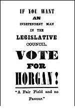 In Western Australia, he turned his energies to improving the standing of the working class. In his work, he took on working men's cases for free, and in 1883–84 he helped secure limited reforms to the Master and Servant Act. In 1886, Horgan, along with Richard "Dickie" Haynes, formed Western Australia's first Eight Hours Association to agitate for the eight-hour day. In May 1886, the Legislative Council's seat of Perth was made vacant by the death of Luke Leake. The following month a by-election was held for the seat, and Horgan nominated. His platform was radical for its time; he advocated responsible government, payment of members, manhood suffrage, a land tax, and a unicameral legislature. He was an aggressive critic of the Government and the colony's powerful ruling elite. It was during this campaign that Horgan first characterised the most wealthy and powerful families of the colony as the "six hungry families", implying that they were hungry for more wealth, power and land. Although Edward Scott easily won the seat, Horgan surprised many by taking second place in the poll. Shortly after the election, he was successfully sued for libel by George Walpole Leake, a member of one of the "Six Hungry Families", and fined £500.[1]