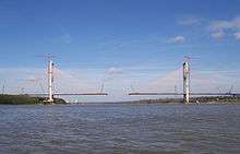 The John James Audubon Bridge, completed and opened in 2011, is a Mississippi River crossing between Pointe Coupee and West Feliciana parishes in south central Louisiana. The bridge has the second longest cable-stayed span (distance between towers) in the Western Hemisphere at 1,583 ft (482 m), after Mexico's Baluarte Bridge with a 1,706 ft (520 m) span, and has a total length of 12,883 ft (3,927 m)nearly three-and-a-half times longer than the Baluarte Bridge's 3,688 ft (1,124 m) total length.[1][6] The Audubon Bridge replaces the ferry between the communities of New Roads and St. Francisville. The bridge also serves as the only bridge structure on the Mississippi River between Natchez, Mississippi and Baton Rouge, Louisiana (approximately 90 river miles). The bridge conveys Louisiana Highway 10, which is in a concurrence there with the Zachary Taylor Parkway.