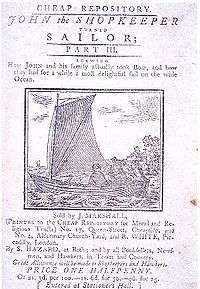 John Marshall (1756–1824) was a London publisher who specialized in children's literature, chapbooks, educational games and teaching schemes. He described himself as "The Children's Printer" and referred to children as his "young friends"[1] He was the preeminent children's book publisher in England from about 1780 until 1800.[2] After 1795 he became the publisher of Hannah More's Cheap Repository Tracts, and following a dispute with More he published his own similar series. About 1800 Marshall began to publish a series of miniature libraries, games and picture books for children. He died in July 1824 and his business was continued either by his widow or his unmarried daughter, both of whom were named Eleanor.
