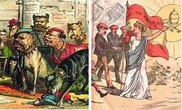 - ↑ the thread was regularly exploited in Liberal propaganda throughout most of the 19th century, with endless articles and cartoons presenting Carlism as a reactionary movement powered by ignorance, fanatism and backwardness. This opinion enjoyed further popularity in the 20th century, perhaps its most famous manifestation having been the phrase attributed to the socialist leader Indalecio Prieto: “a Carlist is a red-topped animal which lives in the mountains, eats communión, and attacks people”, repeated also in progressive 21st century publications, compare e.g. María Eugenia Salaverri, Lecciones de historia, [in:] El Pais 22.08.2014