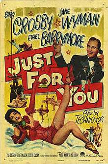 Just for You is a 1952 American musical film starring Bing Crosby and Jane Wyman and the final motion picture to be directed by Elliott Nugent. It was nominated for two Academy Awards in 1953. The film was based on the book "Famous" by Stephen Vincent Benét.[2] Filming took place between October 22 and December 20. 1951. It is said that Judy Garland had originally been sent a script as she was being considered for the female lead, but she apparently decided not to proceed with the project. Location scenes were filmed at Lake Arrowhead, near San Bernardino, California and at Big Bear Lake in the San Bernardino National Forest.[3]