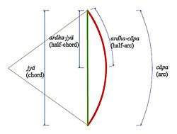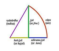 Jyā, koti-jyā and utkrama-jyā are three trigonometric functions introduced by Indian mathematicians and astronomers. The earliest known Indian treatise containing references to these functions is Surya Siddhanta.[1] These are functions of arcs of circles and not functions of angles. Jyā and koti-jyā are closely related to the modern trigonometric functions of sine and cosine. In fact, the origins of the modern terms of "sine" and "cosine" have been traced back to the Sanskrit words jyā and koti-jyā.[1]