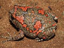 The Sri Lankan painted frog, Sri Lankan bullfrog sometimes just called the painted frog (Kaloula taprobanica) is a species of narrow-mouthed frog found in Nepal, Bangladesh, southern and eastern India and Sri Lanka[2] up to an altitude of about 1300 metres.[1] It is a common species, the adult of which is up to 75 millimetres long from snout to vent. It was originally described as a subspecies of Kaloula pulchra, ssp. taprobanica.[3] The IUCN lists it as being of "Least Concern".[1]